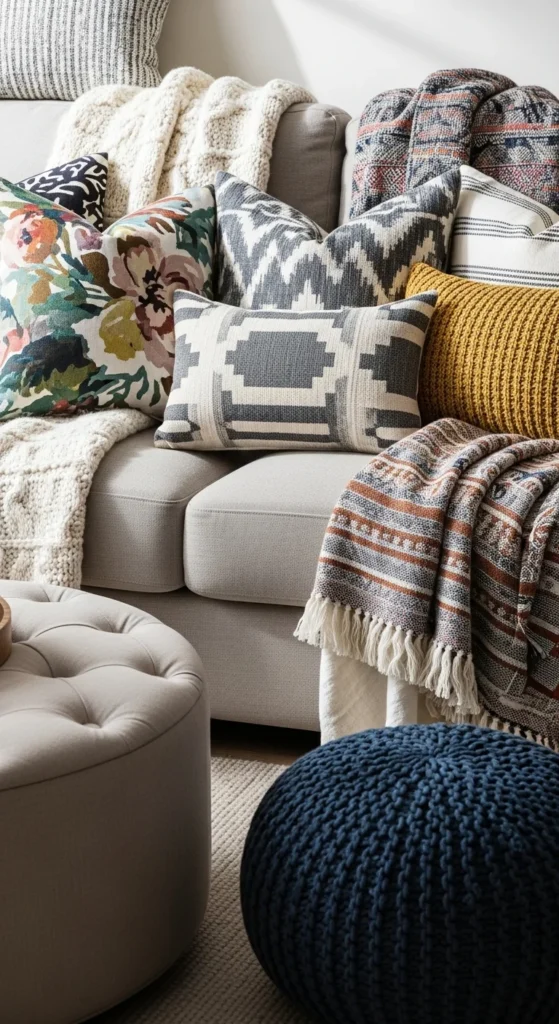 Pillows, throws, and soft furnishings make a room feel instantly lived-in. Mix and match them thoughtfully for visual and tactile warmth.