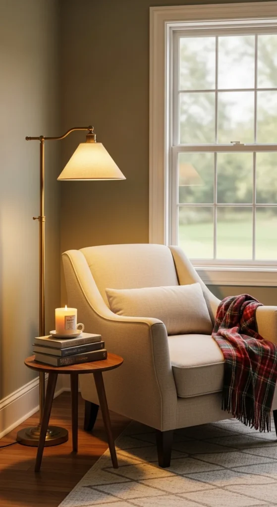 • Create a reading nook with an armchair, floor lamp, and soft throw.