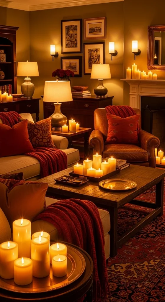 Harsh overhead lighting can instantly ruin cozy vibes. Instead, think in layers of light — soft, glowing, and flexible.