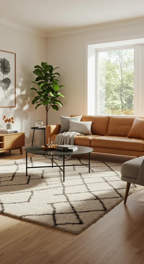 - Round or oval rugs soften angular furniture and create an inviting focal point.