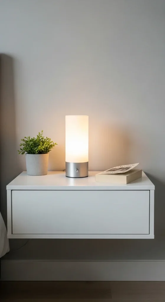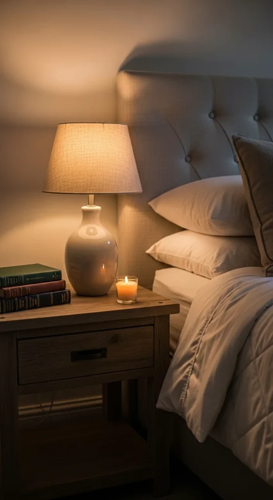 A warm, ambient table lamp is the heart of bedside decor. Skip harsh white bulbs—choose soft yellow or dimmable lights for that relaxing bedtime feel. Lamps with linen or woven shades spread light gently across the room. Pair your lamp with a neutral base like wood or ceramic for a timeless look. For smaller tables, a compact or wall-mounted lamp saves space while keeping the cozy factor intact.