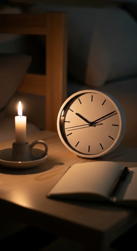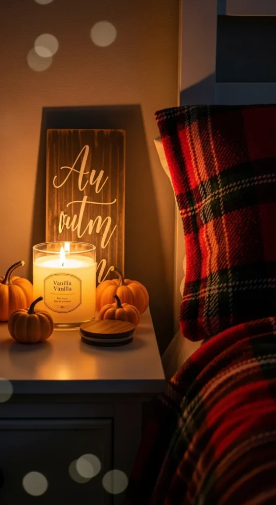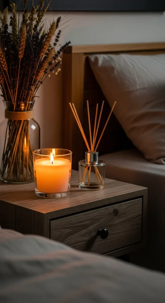 [Image Prompt: A softly glowing candle beside a reed diffuser on a nightstand, next to a linen bed and dried flower vase.]