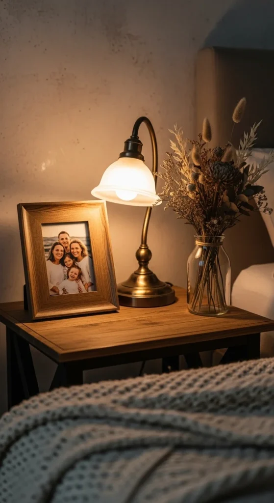 Personal touches make your nightstand feel like yours. A single photo frame—whether a loved one, pet, or vacation memory—adds warmth and meaning. Choose minimalist or rustic frames that match your room’s tone. You can even mix it up seasonally with art prints or pressed botanical photos.