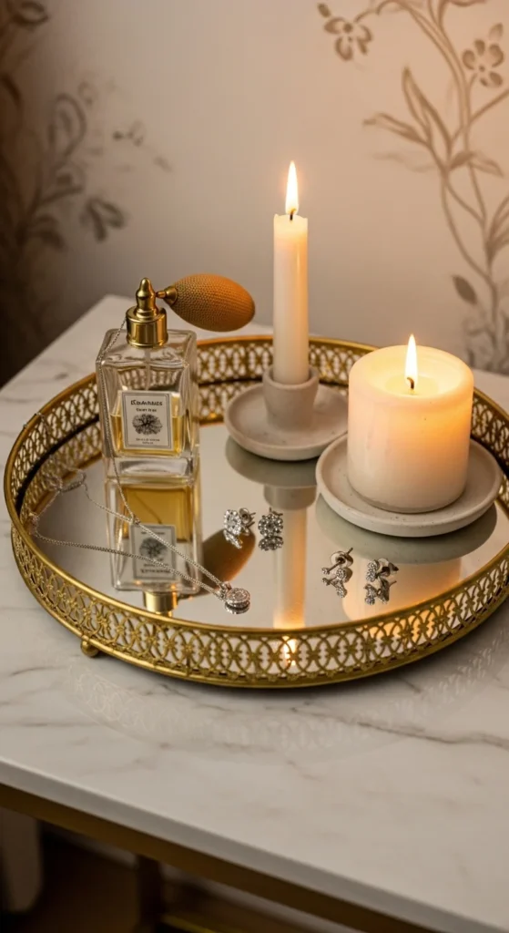 Trays are both stylish and functional. They keep everyday essentials—like rings, glasses, or perfume—neat and intentional. Choose metal or woven trays to add texture contrast. Round trays soften straight-lined tables, while rectangular ones keep things structured.