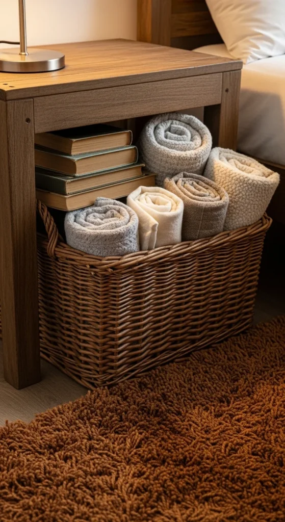 If your nightstand has space underneath, tuck in a small basket for texture and storage. It’s perfect for magazines, extra throws, or slippers. Natural fibers like rattan or seagrass keep things warm and earthy.