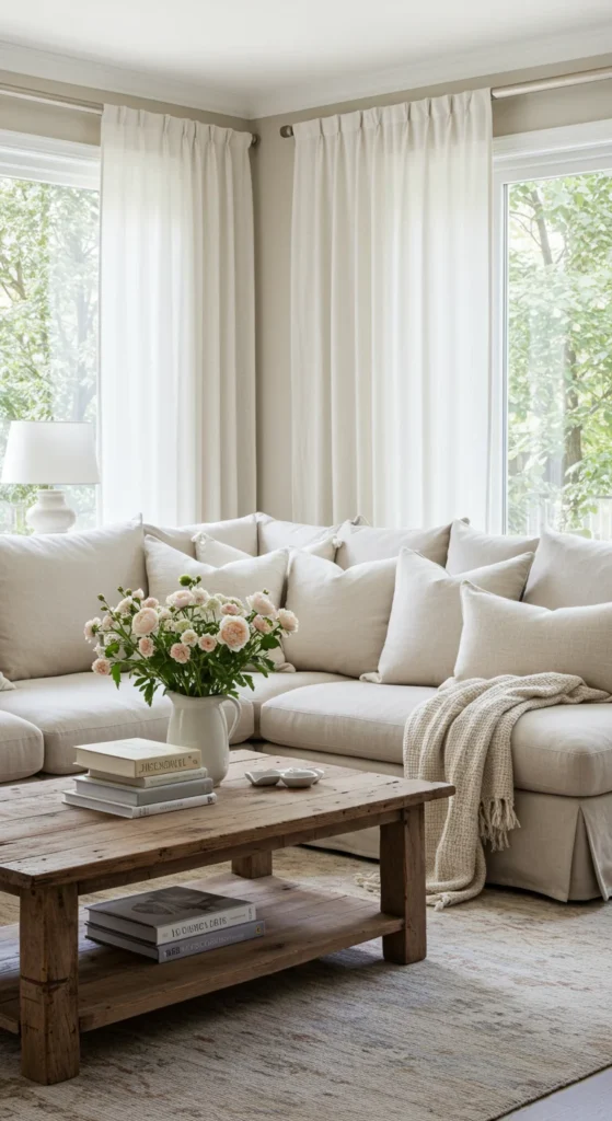 - If you love switching out pillows and throws seasonally, a neutral sofa gives you more flexibility to experiment with bolder accents.