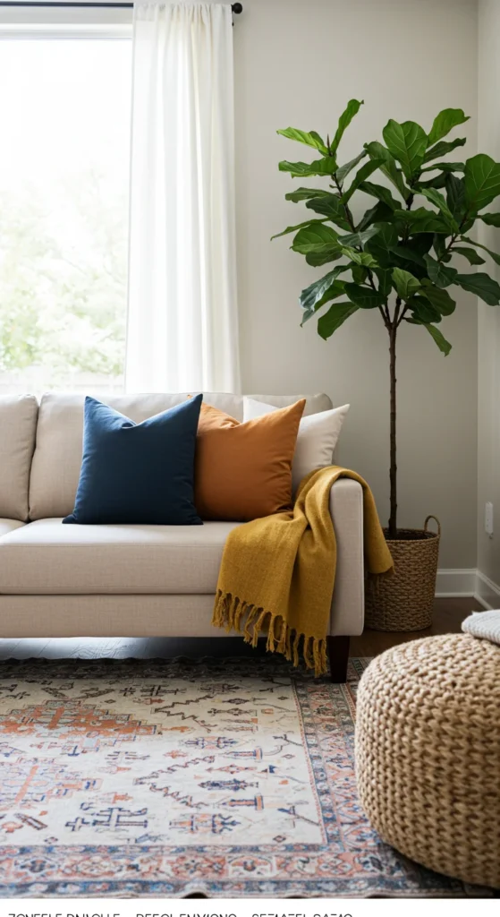 Accessories make it easy to refresh your space without committing to a dramatic sofa color.