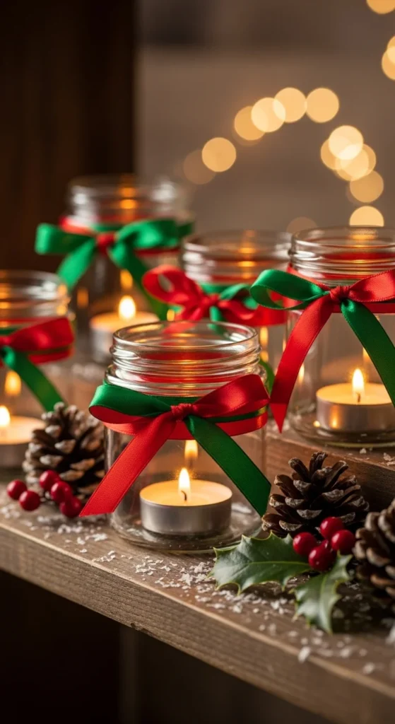 Place tealights or LED candles inside the jars. These work nicely on bookshelves or nightstands where you want a small holiday glow. Mix different ribbon patterns so the arrangement feels playful.