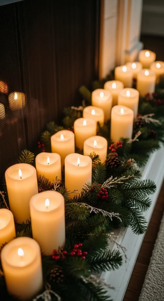 Place them in a loose grid pattern with a few inches between each one. Add a small garland or pine sprigs along the back edge for a seasonal touch. LED pillar candles are a great choice here because they stay on for hours without effort.