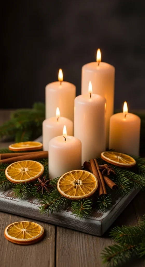 Dried citrus slices add bright color and a natural winter touch. Arrange them around pillar candles on a tray or wooden board. Add a few pine sprigs and cinnamon sticks to complete the look.