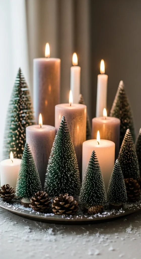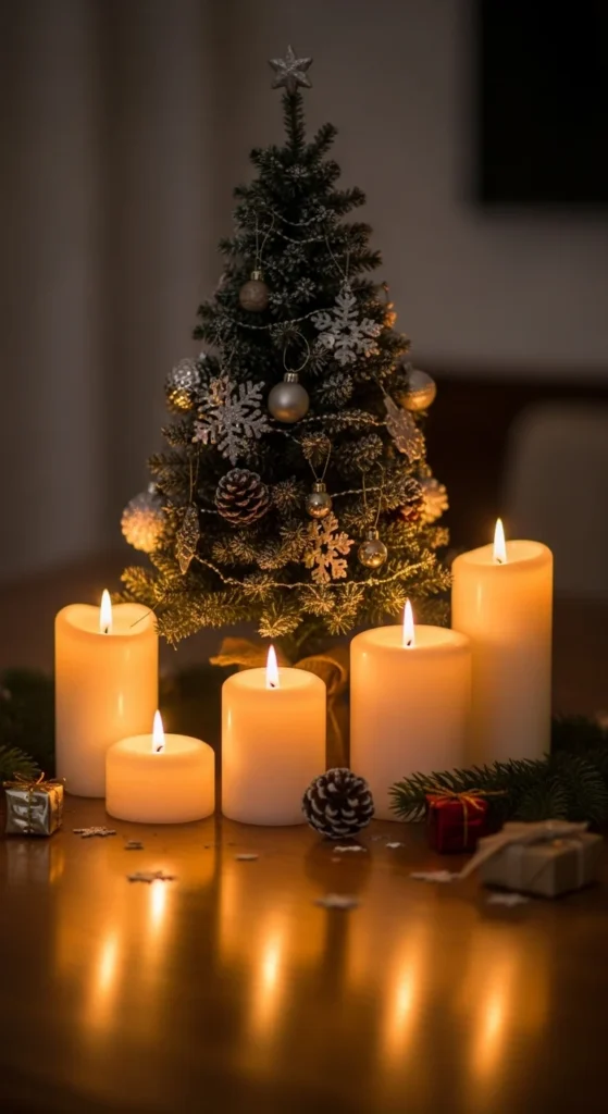 Add a small tree skirt or piece of fabric to anchor the display. The glow from the candles reflects off the ornaments and creates a warm, cozy effect.