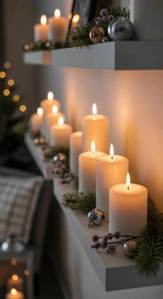 LED candles work especially well on shelves because they’re safe and long-lasting. Mix heights but keep the color palette light and calm.