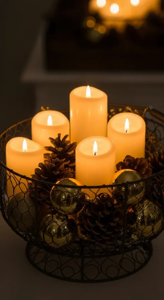 A metal basket makes a great base for a simple candle setup. Fill it with candles in mixed sizes, along with pinecones or ornaments. Keep the color scheme limited to two or three tones so it looks clean.