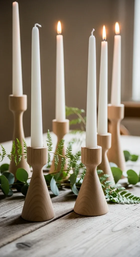 Wooden candle holders bring a calm and natural holiday look. Arrange them with tall taper candles in neutral colors. Keep the setup minimal with just a few sprigs of greenery around the base.