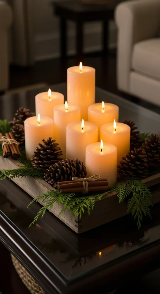 Choose candles in shades of ivory or soft gray to keep the look natural. If you want extra contrast, use dark pinecones beside lighter candles. This creates a calm winter feel that works anywhere in the home.