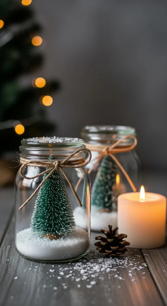 Turn simple jars into snow-globe-style displays. Add faux snow at the bottom, tuck in a mini tree, and place a candle beside the jar or inside (use LED only if placing inside).