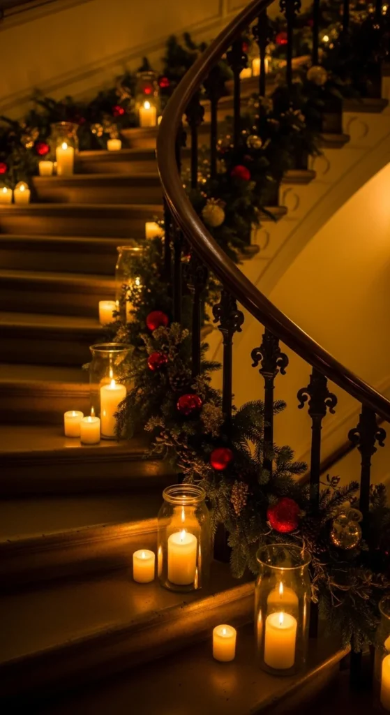 Line your staircase with candle jars for a warm holiday welcome. Use sturdy jars and place LED candles inside for safety. Add small pine sprigs tied with twine around the jar tops.