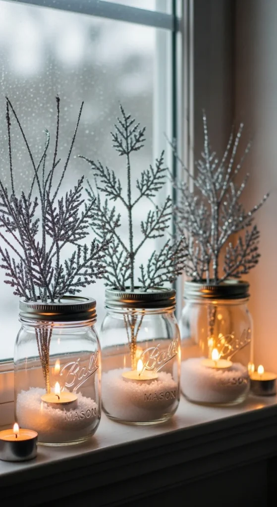 For extra charm, slip in a few tiny pine sprigs or silver twigs before placing the candle. Tie a thin twine or ribbon bow around the jar rim for a small seasonal touch. These jars work beautifully on windowsills since the glow reflects off the glass at night.