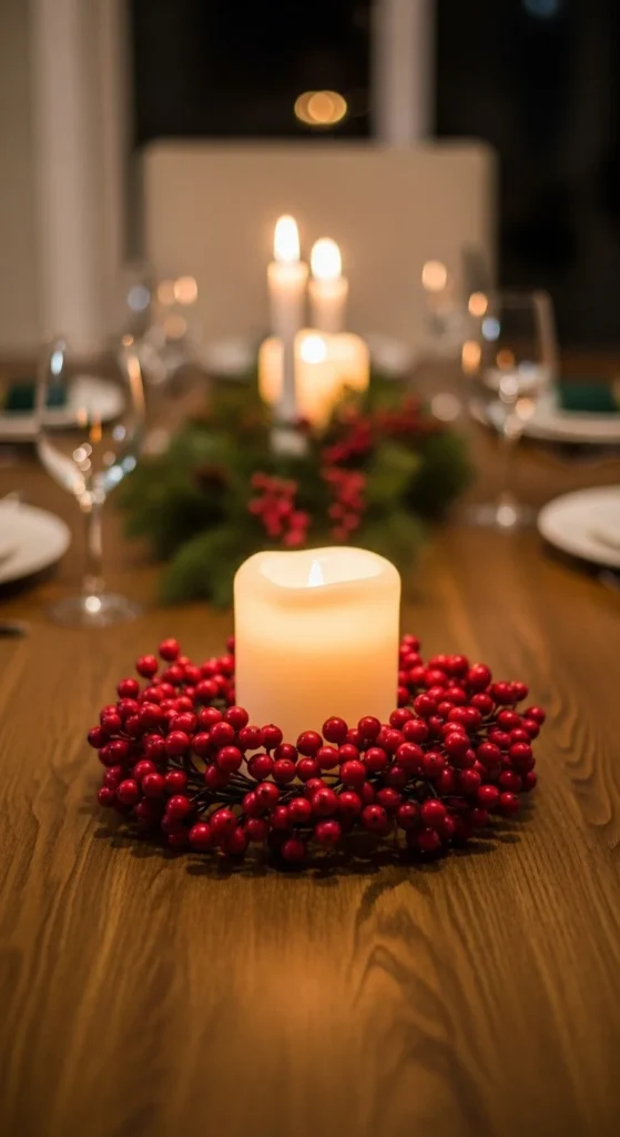 This setup works well on dining tables, sideboards, or kitchen islands. Choose berry rings with small leaves if you want a more natural look. For deeper color, select dark red or burgundy berries. The candlelight will bounce off the glossy berries and brighten the space.