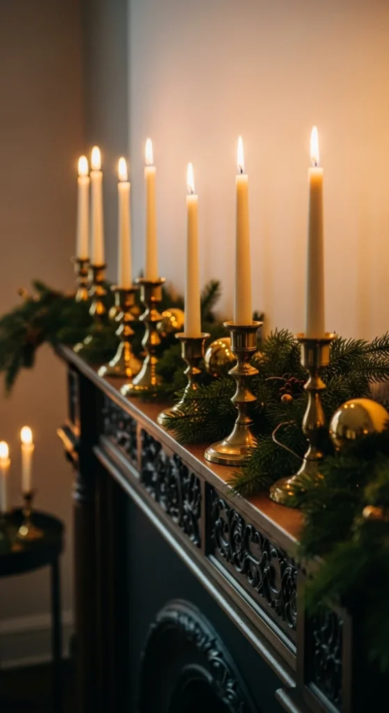 Vintage brass candle holders create a warm glow that feels timeless. Place several across your mantel, mixing heights for a relaxed look. White or deep green tapers work especially well because they contrast nicely against the metal shine.