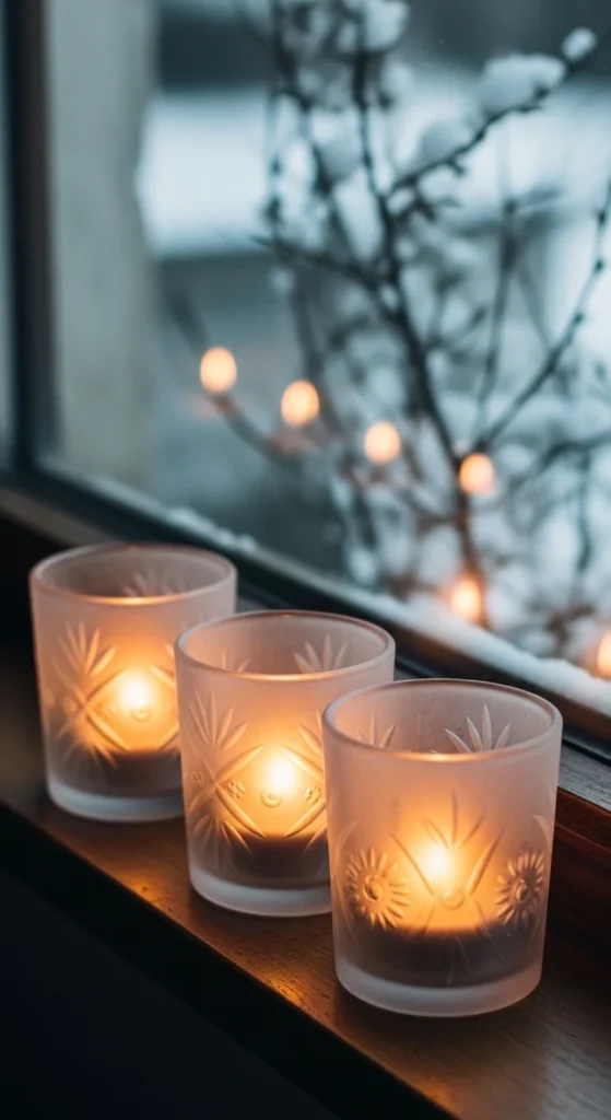 Frosted glass candles create a gentle, diffused glow that works beautifully during winter. Place three or five across your windowsill to get an even spread of soft light. The frost texture helps the glow look calm rather than bright.