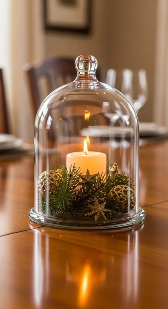 A glass cloche turns a simple candle into a charming holiday display. Place a pillar candle on a small wood or ceramic base, then gently lower the cloche over it. The glass will catch the light and create a warm, enclosed glow.