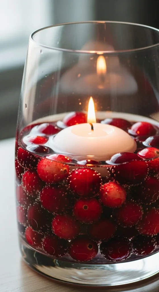 Cranberries add rich color to candle decor. Fill a glass vase with fresh cranberries and water, then place a floating candle on top. The berries sit gently below the surface and reflect the candlelight in a lovely way.