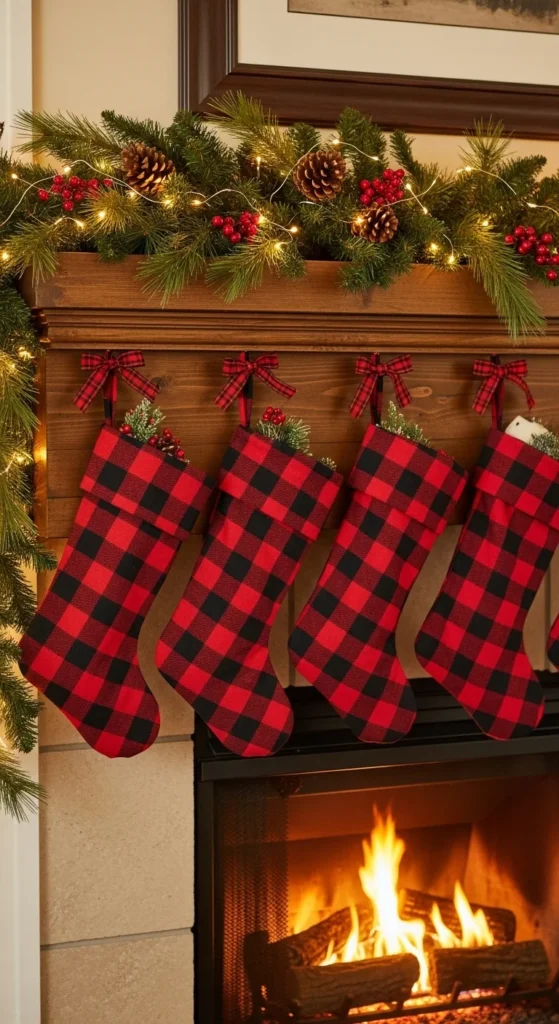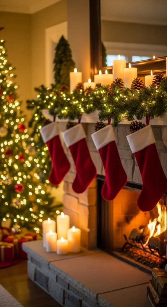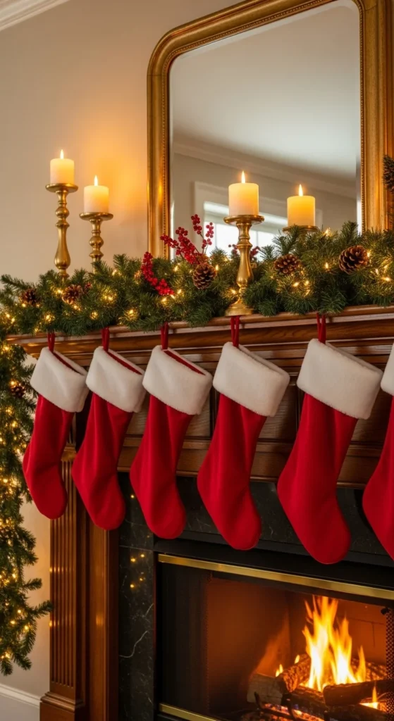 Make stockings the star of your decor. Choose a mix of textures—velvet, burlap, or knit—for visual interest. Personalize each with embroidered names or initials. Keep the rest of the mantel simple with candles and greenery to highlight the stockings themselves.