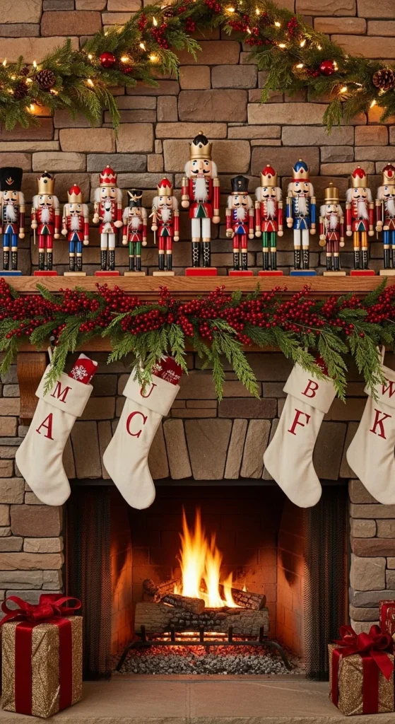 Channel traditional Christmas magic with nutcrackers as your focal point. Line them along your mantel and accent with red garland or twinkle lights. Add a few gold ornaments or ribbon bows for flair. It’s playful, nostalgic, and brings childlike wonder into your space.