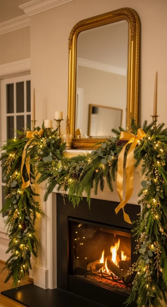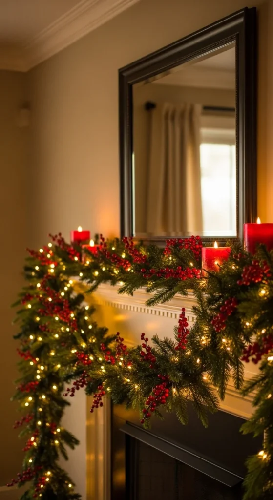 Nature-inspired mantels always feel inviting. Combine garlands of cedar or pine with clusters of red berries. Add warm string lights and wooden candleholders. This look feels alive and cheerful, perfect for those who love traditional holiday greenery with a pop of color.