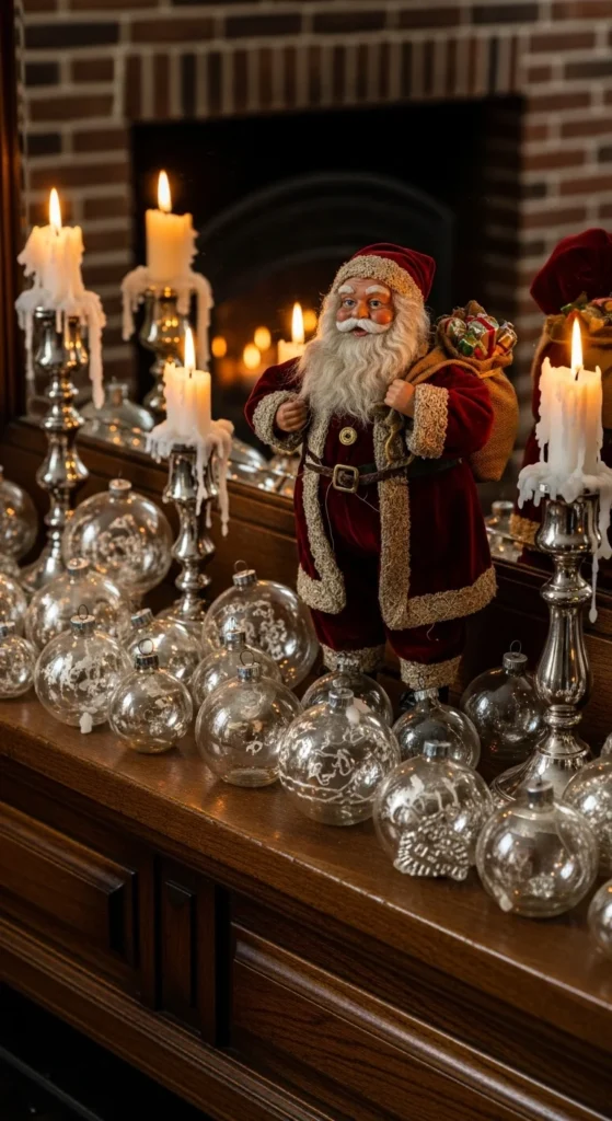 Bring back Christmas charm from decades past with vintage touches. Use old glass ornaments, antique clocks, or weathered candleholders. Add nostalgic items like a ceramic Santa or a train set. This cozy, memory-filled mantel brings warmth and timeless joy to your holiday decor.