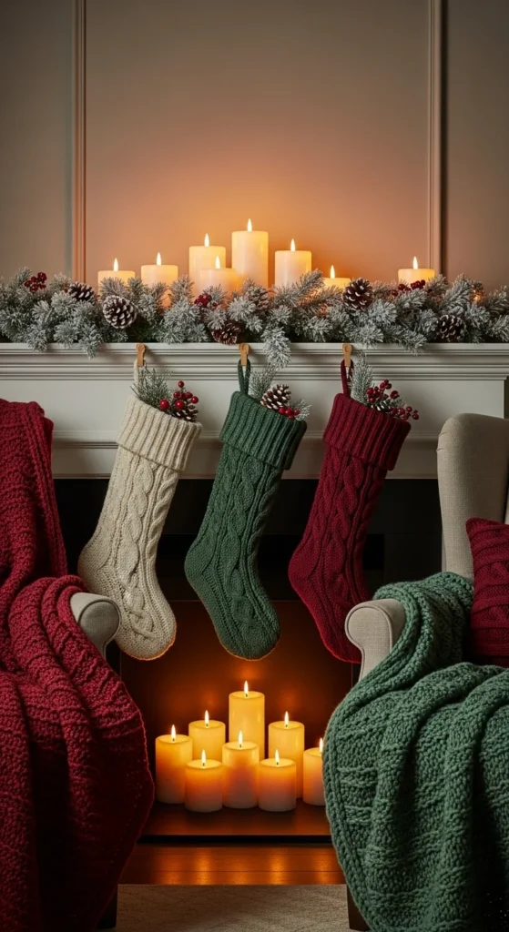Soft textures add instant warmth. Hang chunky-knit stockings and layer cozy fabrics like faux fur or wool throws nearby. Pair with white candles and greenery. This cozy, tactile approach makes your space feel intimate and perfect for fireside evenings.