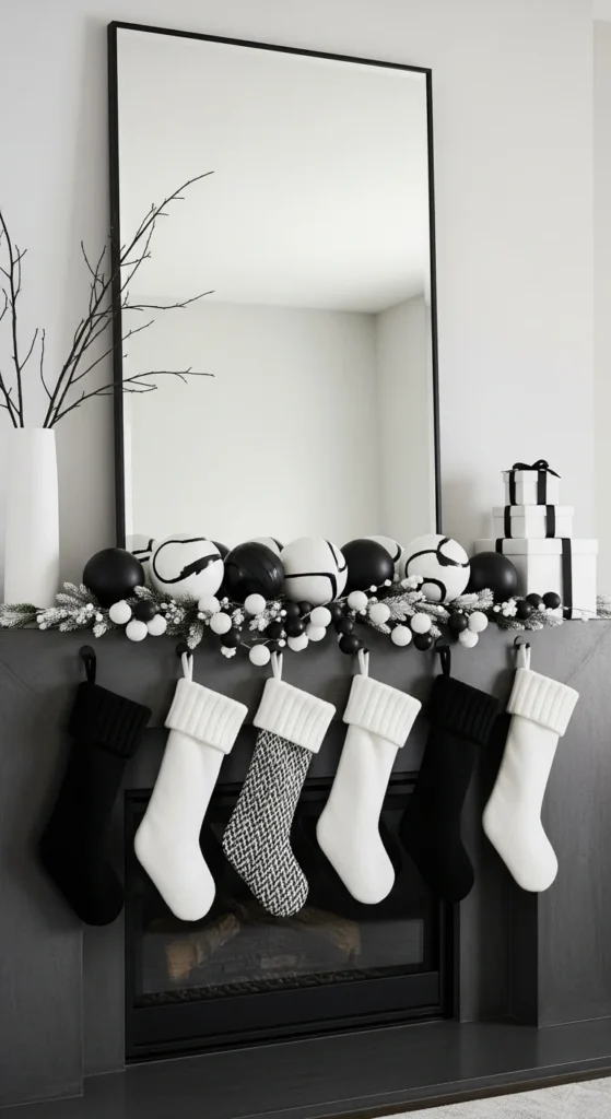If you love contemporary decor, try black and white for a sleek, graphic look. Use monochrome stockings, matte ornaments, and a simple garland. Add metallic accents in gold or silver for contrast. This design feels bold and elegant without losing festive charm.