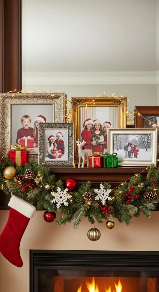 Make your mantel personal with cherished family photos. Use matching frames in gold, white, or wood tones. Weave greenery and lights around them for a cohesive look. It’s a heartwarming way to celebrate your memories while keeping the decor stylish and sentimental.