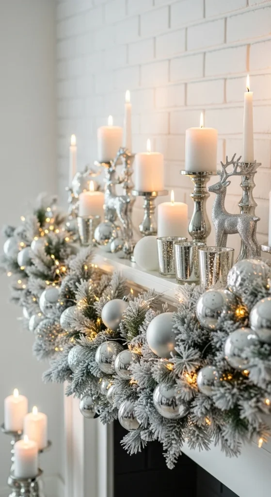Turn your mantel into a serene winter escape with all-white decor. Use flocked garland or artificial snow spray for texture. Layer in white stockings, candles, and ornaments in silver or pearl tones. Add soft fairy lights for a gentle glow. This look pairs beautifully with minimalist interiors and creates a calm, magical feel reminiscent of freshly fallen snow.