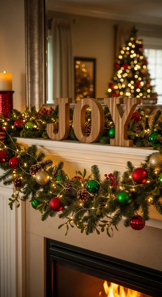 A simple word sign—like “JOY,” “NOEL,” or “MERRY”—makes a striking centerpiece. Place it above your garland and surround it with small decor accents. The bold letters immediately catch the eye and bring festive energy to the room.