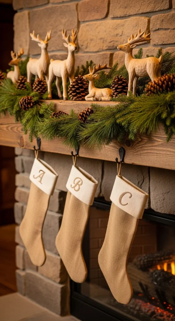 Bring the outdoors in with a woodland-inspired display. Combine natural elements like pinecones, evergreen sprigs, and twigs. Add burlap or plaid stockings and wooden decor such as deer figurines. Keep lighting warm and soft—like amber string lights. The result feels earthy, cozy, and reminiscent of a cabin Christmas retreat.
