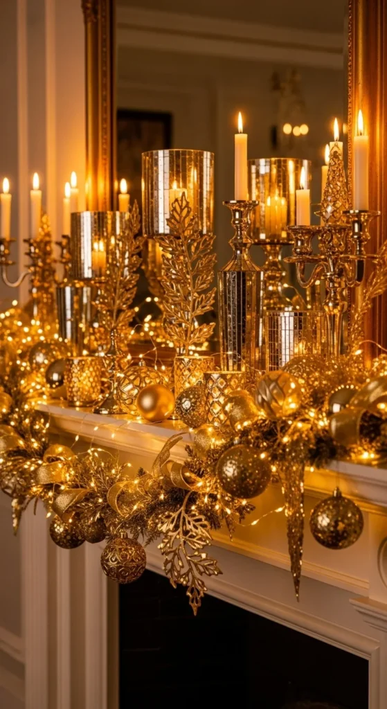 For a chic and radiant look, embrace gold tones. Drape your mantel in metallic ribbon, gold ornaments, and shimmering candles. Add a few glass or crystal pieces to reflect light beautifully. This theme pairs perfectly with white, cream, or blush backdrops and adds instant sparkle without being over the top.