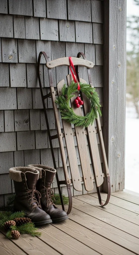 Old sleds make perfect Christmas props. Lean one by your door and decorate it with a wreath, bow, or greenery. You can find inexpensive vintage-style sleds online or at flea markets. Add a pair of old boots beside it for a charming, lived-in look.