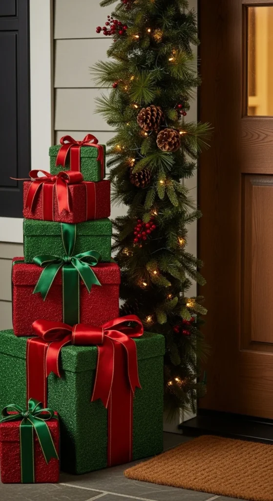 Stack “gifts” made from cardboard boxes wrapped in weatherproof paper. Place them beside your steps or under a mini tree. Use different sizes and colors for dimension. It’s a cheerful touch that feels whimsical and fun—without any risk of soggy wrapping paper.