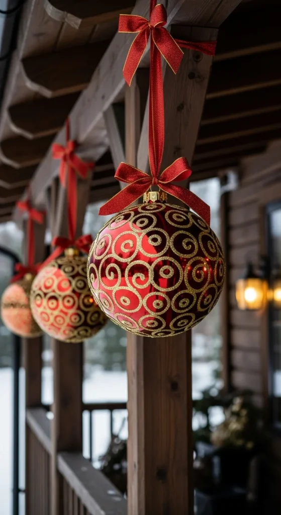 Don’t limit ornaments to your tree—hang them outside too! Suspend oversized baubles from your porch ceiling using ribbons or twine. Choose colors that complement your theme. They catch the light beautifully and add movement to your decor.