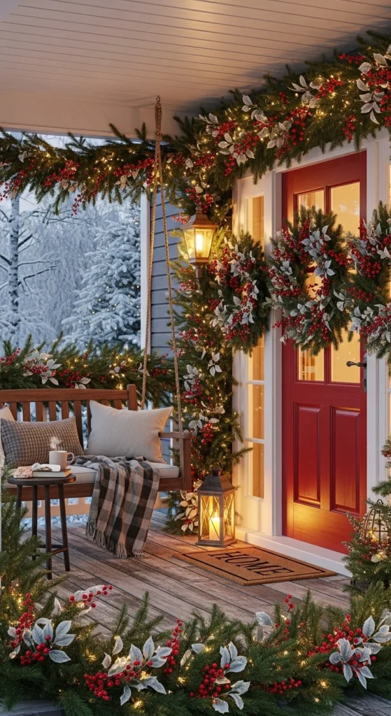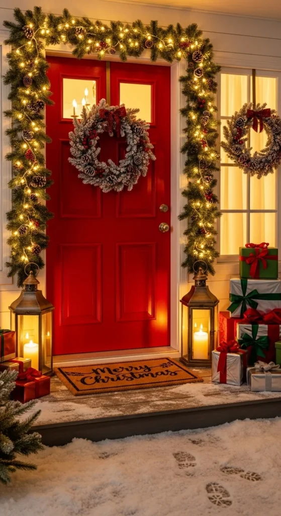 Nothing feels more Christmas-ready than red and green. Frame your doorway with evergreen garlands and add big red bows for contrast. Fill planters with small evergreens, berries, and pinecones. A red plaid doormat ties it all together. This timeless setup works beautifully with any home style and instantly feels warm and inviting.
