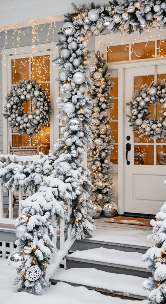 For an elegant, frosty look, stick to all-white and silver decor. Use flocked garlands, snowflake ornaments, and frosted pinecones. Add soft string lights to create a gentle glow that mimics glistening snow. White lanterns or silver planters complete the peaceful, wintry vibe that feels both cozy and sophisticated.