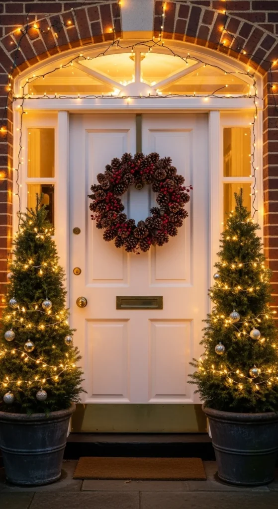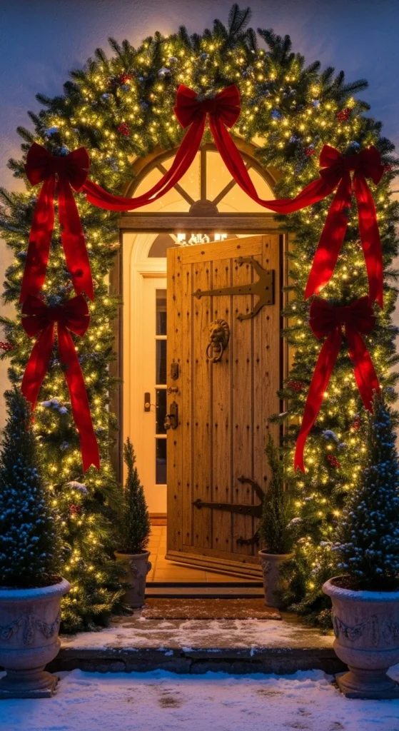 Make your door a true centerpiece with an arch of garlands and ribbon. Add twinkle lights for an extra glow at night. You can even attach ornaments throughout for sparkle. It’s festive, grand, and ideal for welcoming guests.