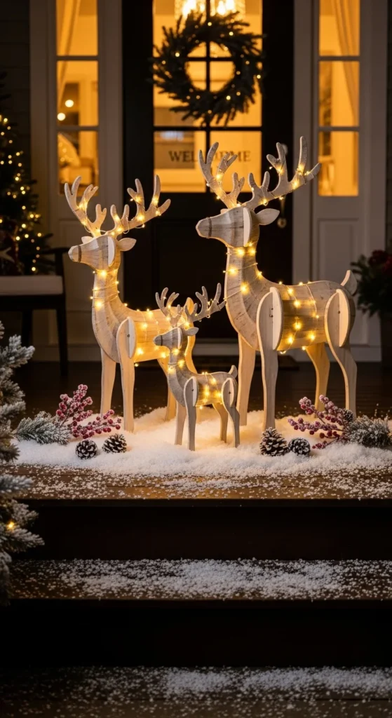 Small reindeer figures bring playful spirit to your porch. Whether metal, wood, or wicker, they fit beautifully among trees or lights. Add bows or fairy lights to make them stand out. It’s a sweet touch that captures holiday whimsy.