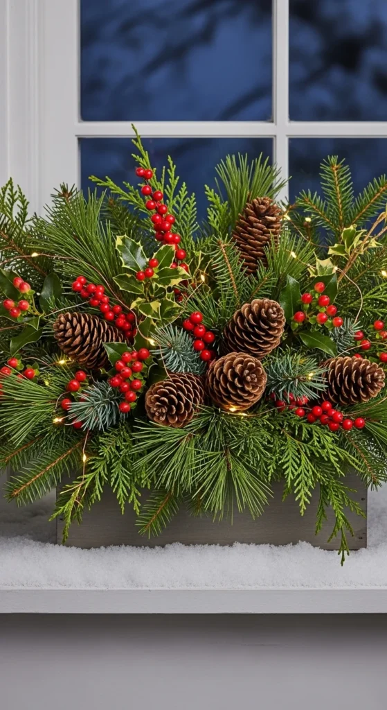 If your porch has windows, decorate the boxes too. Fill them with evergreens, berries, and twinkle lights. They look stunning both day and night and create a seamless, festive look that extends beyond your door.