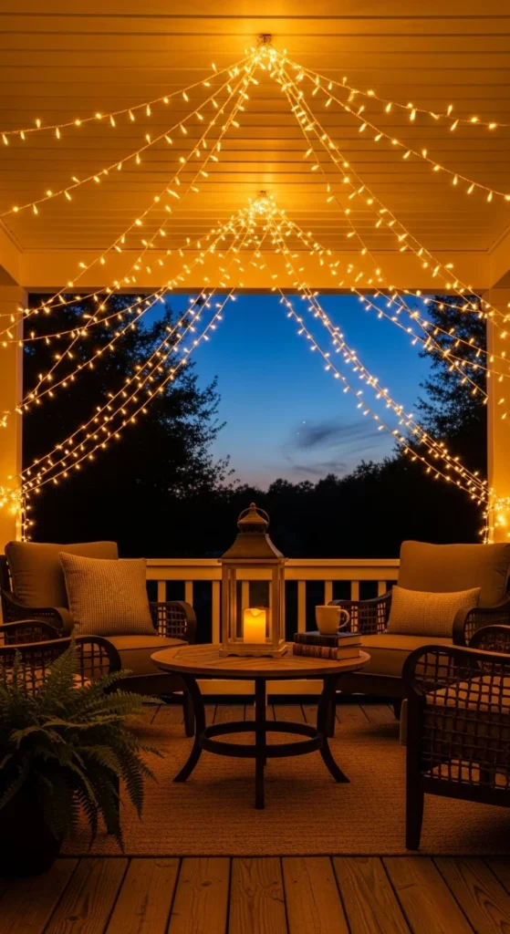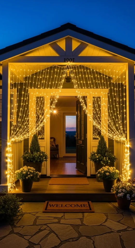 Create a dramatic light curtain by hanging string lights from your porch ceiling or railing. It adds instant magic and looks amazing at night. Choose warm white bulbs for a cozy look or multi-color for festive fun. It’s a show-stopping yet easy-to-install feature.