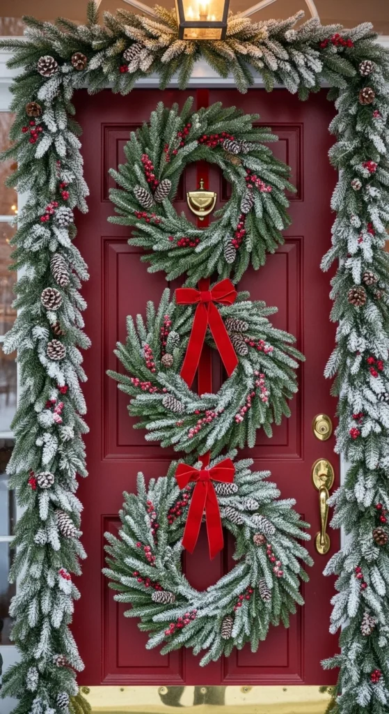 Why settle for one wreath? Stack two or three smaller ones vertically on your door with wide ribbon. Mix in pinecones or berries for texture. You can even alternate colors for a more playful twist. It’s an easy way to turn a simple door into a festive statement piece.