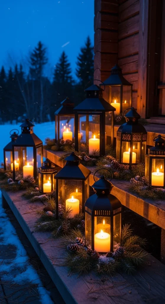 Lanterns add warmth and elegance. Arrange different sizes down your steps or beside the door. Fill them with flameless candles, pine sprigs, or small ornaments. For an extra spark, weave fairy lights inside. They make every winter evening feel cozy and bright.
