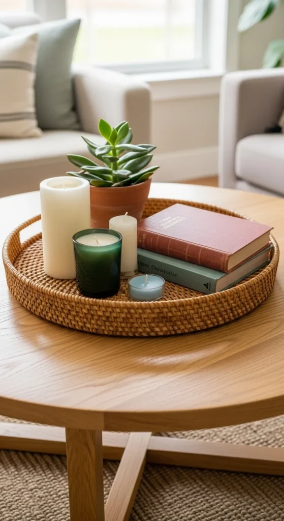 A tray adds structure and keeps things tidy. Choose one that complements your decor—rattan for a boho feel, mirrored for glam, or wood for rustic charm. Arrange items inside like candles, books, and a small vase. It’s both beautiful and practical.